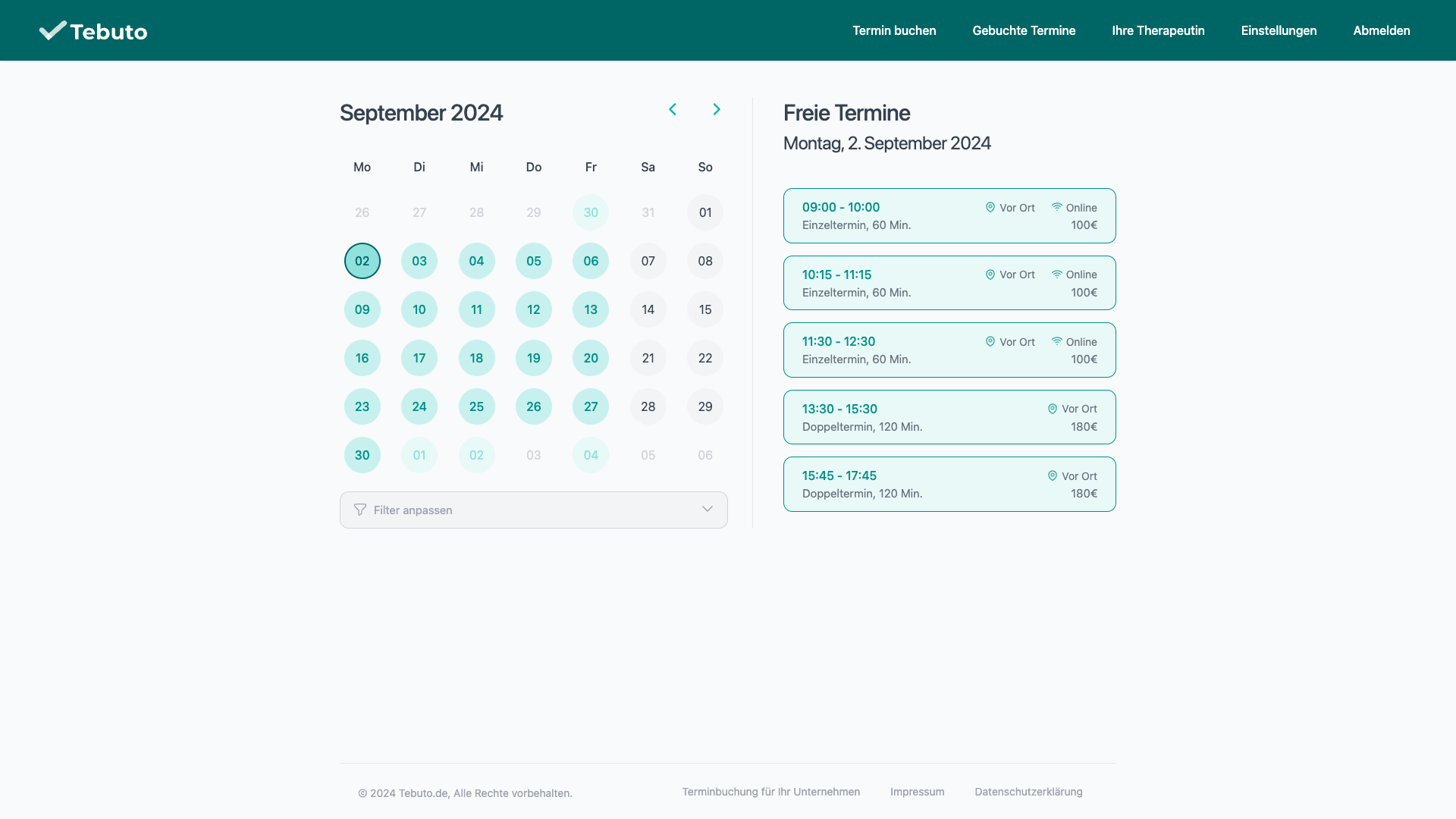 Tebuto ist eine spezialisierte Plattform zur Online-Terminbuchung für Psycholog:innen und Therapeut:innen. Die Lösung wurde entwickelt, um die alltäglichen Herausforderungen des Terminmanagements zu vereinfachen und Praxen effizienter zu gestalten. Mit Funktionen wie automatisierter Kommunikation, Kalenderintegration und Online-Therapie ermöglicht Tebuto mehr Zeit für Klient:innen und eine höhere Zufriedenheit.