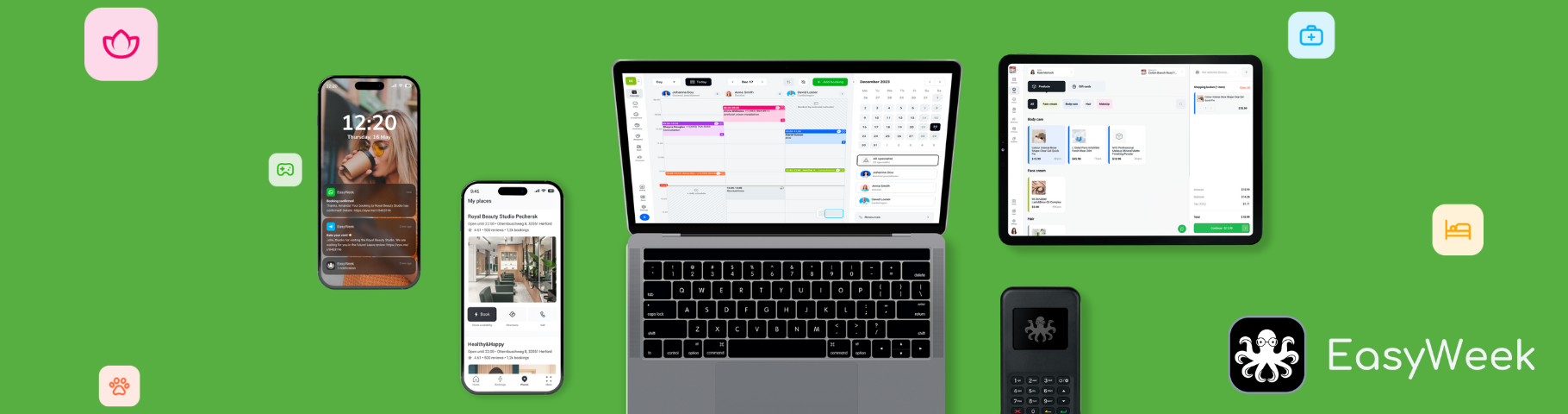 Ob Sie ein Friseursalon, Fotostudio, medizinische Praxis, Fitnessstudio, Beauty-Salon oder Tierklinik betreiben – EasyWeek hilft Ihnen dabei, die Terminverwaltung, Zahlungsabwicklung, Kundenmanagement, Ressourcenzuteilung und Mitarbeiterkoordination effizient zu gestalten.